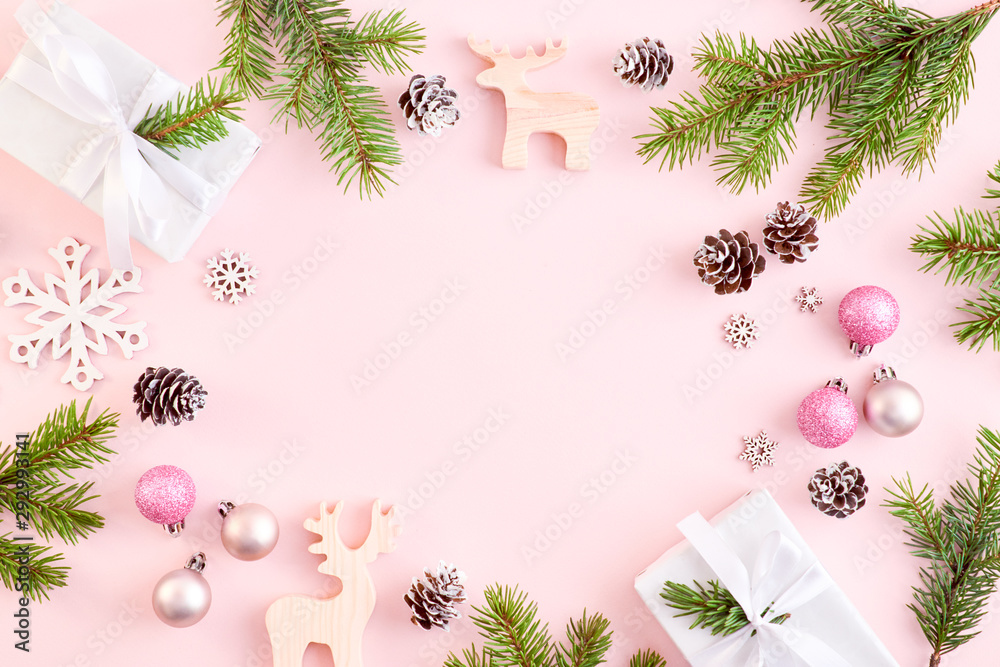 Flat lay frame with spruce branches, christmas decorations and gift box on a color background
