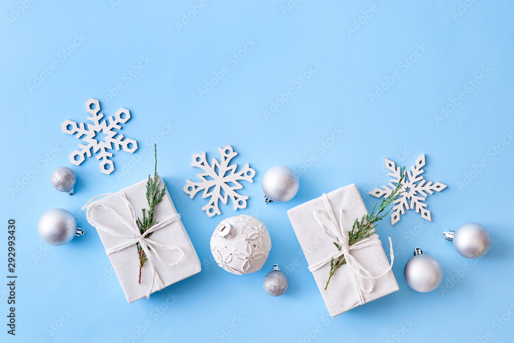 Flat lay christmas border with silver christmas balls and gift box on a blue background