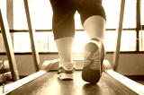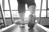 closeup of leg of fat woman being run or jog on belt of treadmill machine