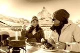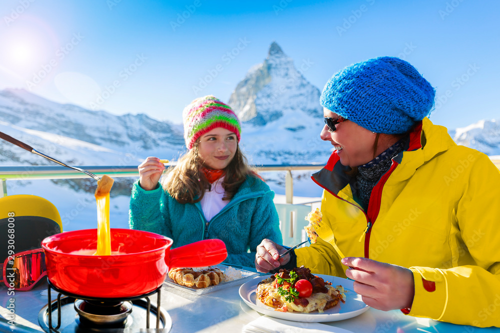 Fondue cheese, swiss winter ski holidays break for lunch, mountain view Matterhorn in Zermatt, Switzerland.