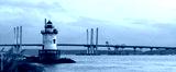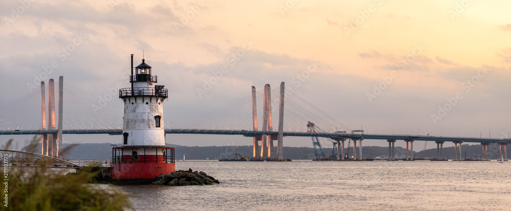 Panorama of a caisson (sparkplug) style lighthouse under soft golden light with a bridge in the background. Tarrytown Light on the Hudson River in New York.