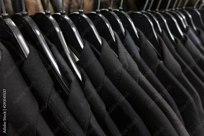 Male Mens Dark Suits on Hangers on a Shop Wardrobe Closet Rail
