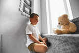 little boy is hugging a teddy bear, smiling while sitting on stairs at home