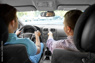 driver courses and people concept - car driving school instructor teaching young man to drive