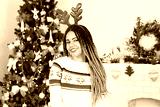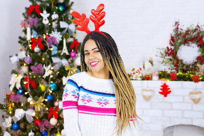 African american young woman, Christmas Eve with gifts, holiday home background. New Year Close up happy excited dark skinned afro girl, christmastime winter clothes. Xmas celebration. Selective focus