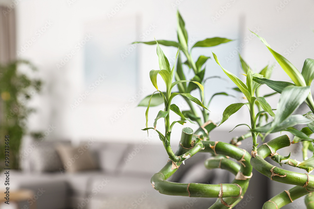 Bamboo stems in living room, closeup. Space for text