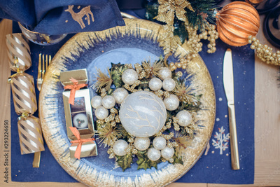 Top view Christmastime table setting, festive dinnerware decorated with details and balls in Blue and Gold colors. Navy Blue Table Linens and Gold Cutlery. Trends of Winter Holiday Tablescape Decor.