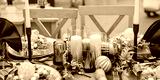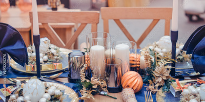Christmastime table setting, festive dinnerware decorated with details and candles in Blue and Gold colors. Navy Blue Table Linens and Gold Cutlery. Trends of Holiday Tablescape Decor. Wide banner.