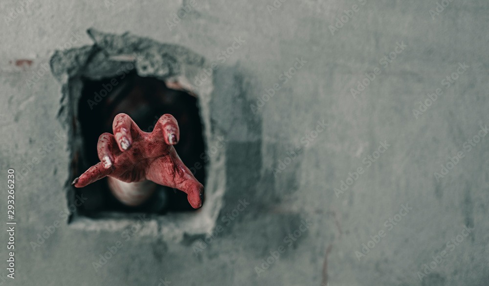 Horror Scene of a Woman with bloody hands in abandoned building, Halloween murder concept.