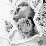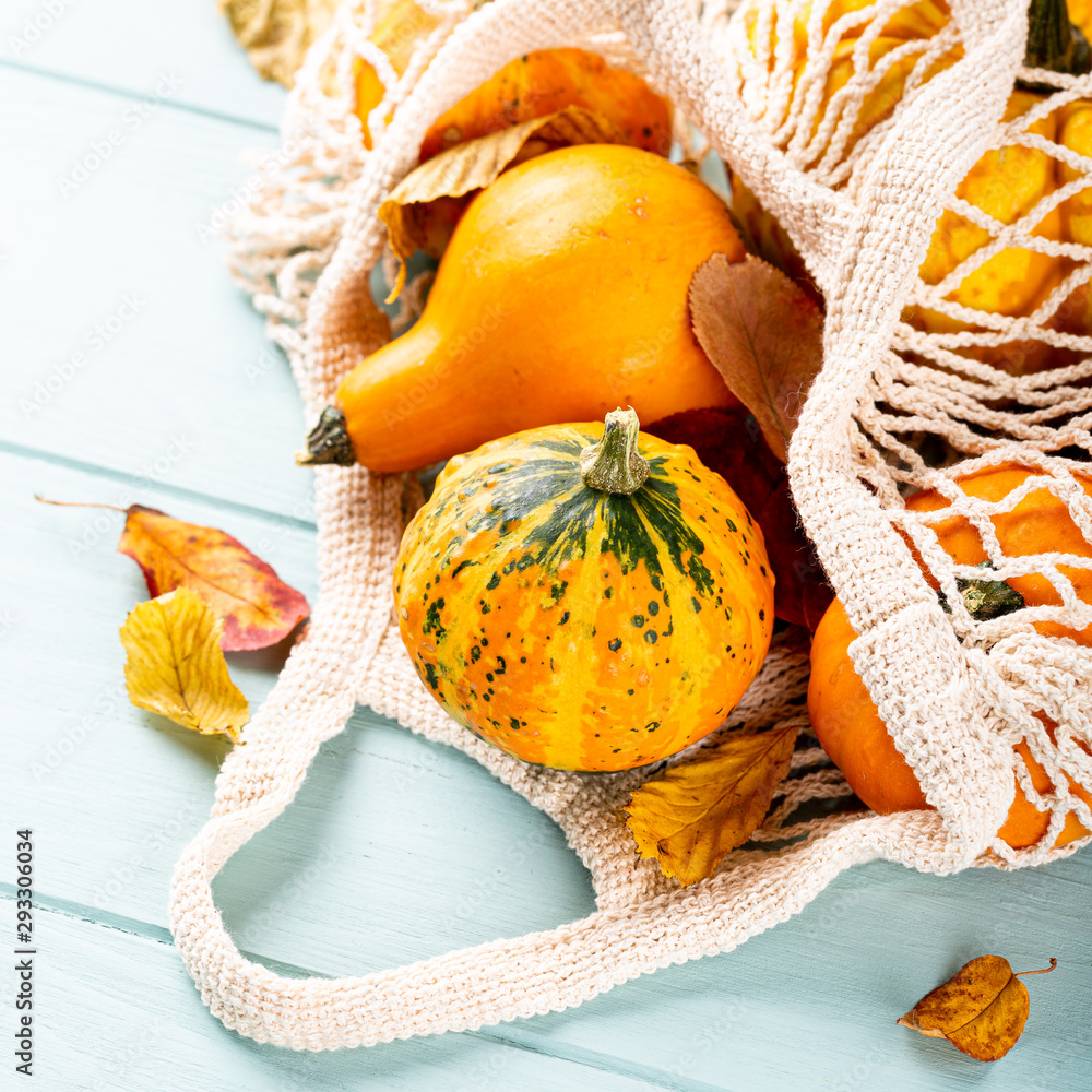 Autumn composition with assorted pumpkins in white string bag, thanksgiving background. Copy space.