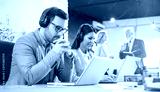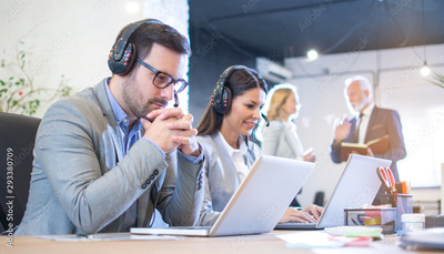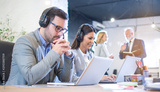 Pensive or worried customer support agent with headset looking at laptop's screen.