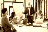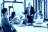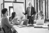 Senior manager explaining pie chart to coworkers in modern office. Senior executive giving presentation to colleagues over flip chart while they clapping hands and celebrating successful presentation.