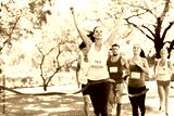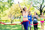 fitness, sport and success concept - happy woman winning race and coming first to finish red ribbon over group of sportsmen running marathon with badge numbers at park