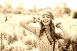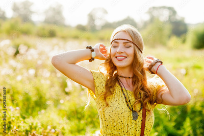 Smiling bohemian girl in yellow dress with guitar on the field at sunset