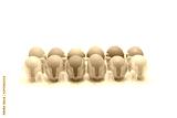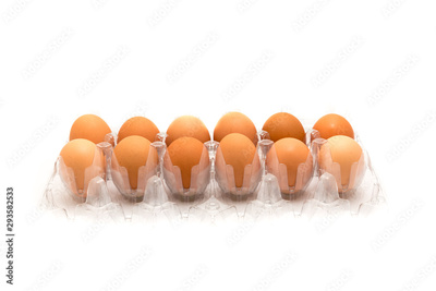 Studio shot plastic egg box with dozen of large brown eggs isolated on white