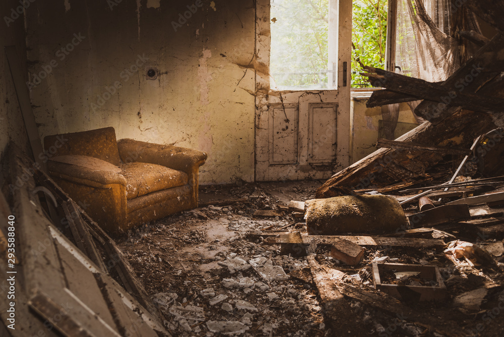 Debris in the collapsed ceiling in the room of the old destroyed house. Haunted house.