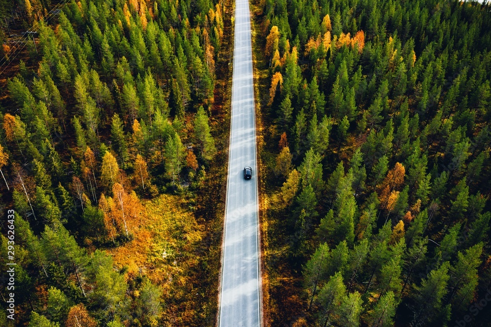 Aerial view of road in beautiful autumn forest in rural Finland.