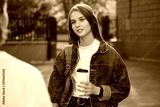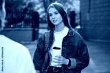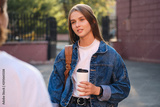 Young attractive student girl in denim jacket with cup to go talking with friend on study break in university outdoor