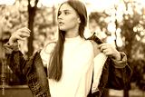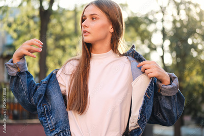 Side view of pretty casual girl wearing denim jacket thoughtfully looking away outdoor