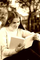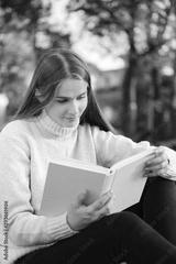 Young pretty student girl in cozy sweater dreamily reading book while studying outdoor
