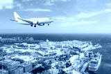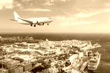Passenger plane approach landing at Malta Valletta great bay with a cruise liner ship.
