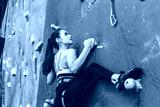 Sportswoman climber moving up on steep rock, climbing on artificial wall indoors. Extreme sports and bouldering concept