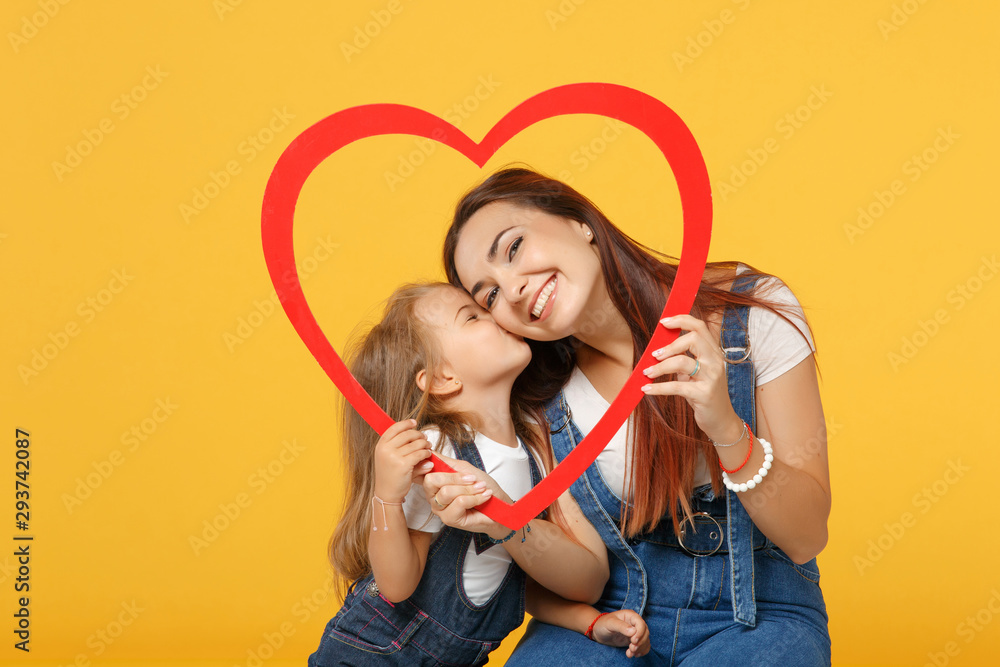 Woman in light clothes have fun with cute child baby girl 4-5 years old. Mommy little kid daughter isolated on yellow background studio portrait. Mother's Day love family parenthood childhood concept.
