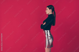 Profile side photo of attractive classy chic lady arrogant boss cross her hands listen strat-up problems wear luxury outfit silver pencil skirt isolated over red color background