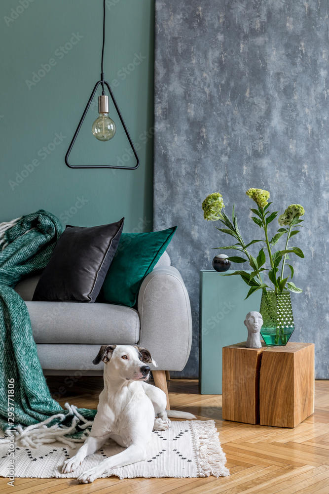 Modern scandinavian home interior of living room with gray sofa, wooden cube, flowers in vase, sculpture, pillows and elegant personal accessories. Stylish home decor. Dog lies on the carpet. Template