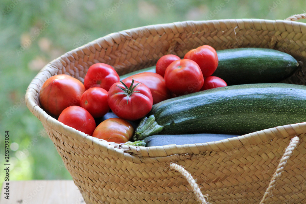 Panier osier de courgettes et de tomates du jardin