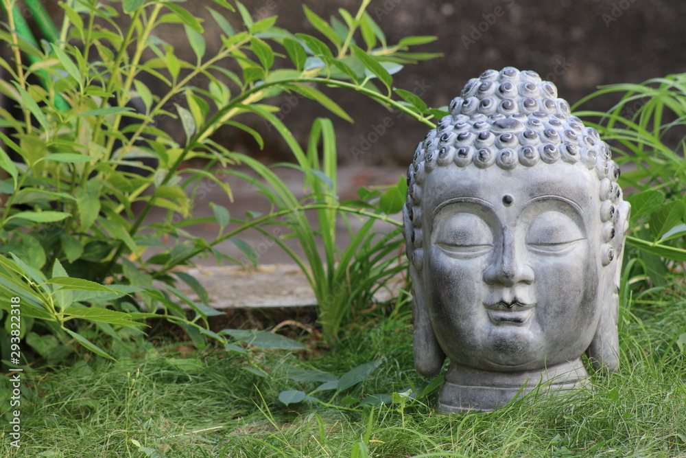 Tête de bouddha dans le jardin, avec arrière plan feuilles