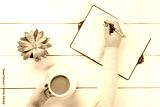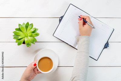 Top view of office desk table. Woman with red nails holding cup of coffee and writing with a pen in a notebook organiser near plant pot on white wooden table.