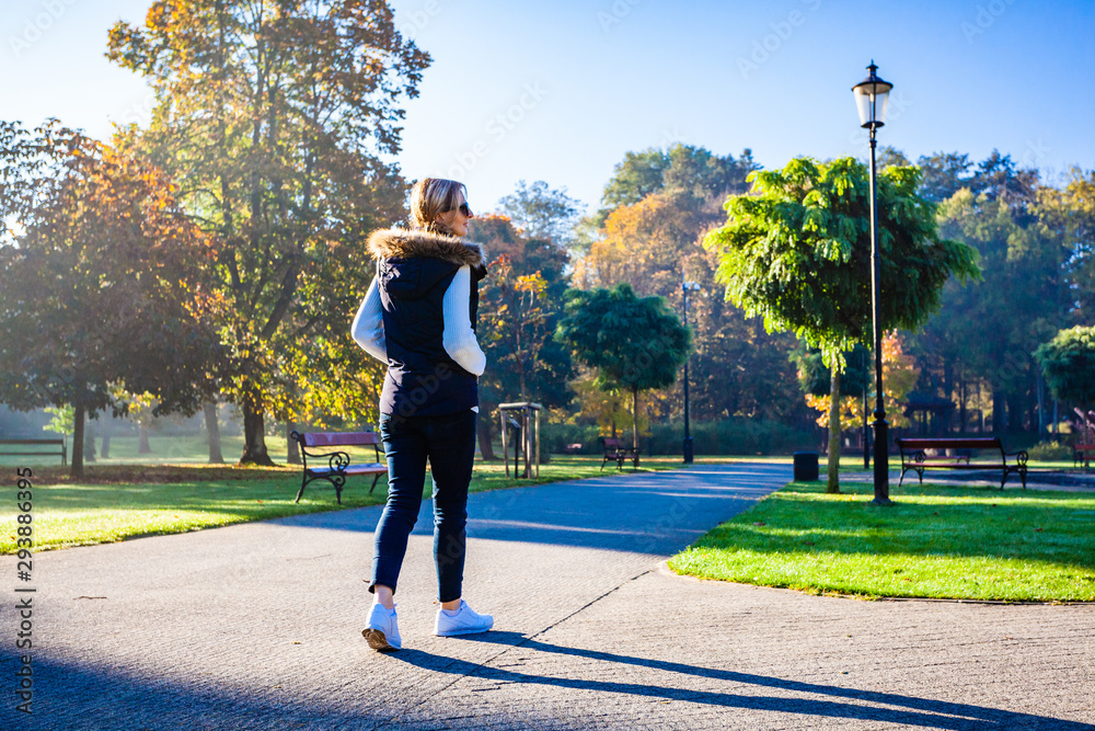 Middle-aged woman walking in city park