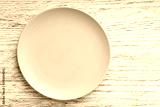 Empty beige dish on a white wooden table. Copyspace for menus and titles