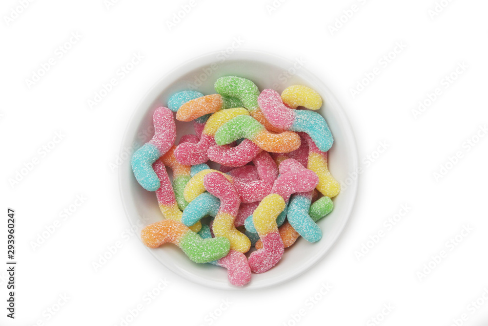 Colorful jelly candies in shape of a worms in a bowl on white background. Gummy worms on white