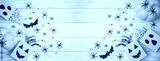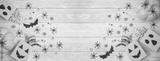 Halloween holiday party background with gift paper bags and candy .Top view from above. Flat lay