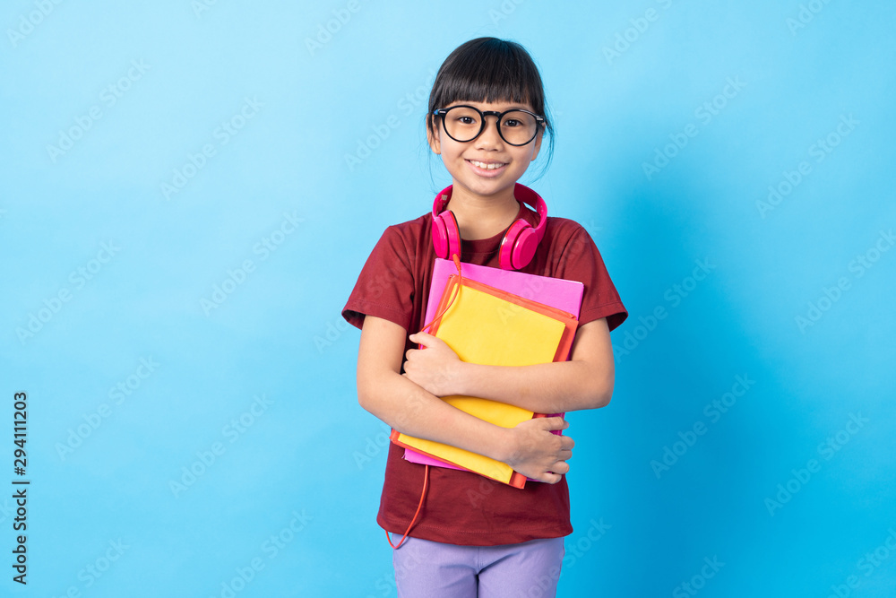 Graduate and education concept, Asia Thai girl kid student holding books and earphone on blue background in studio