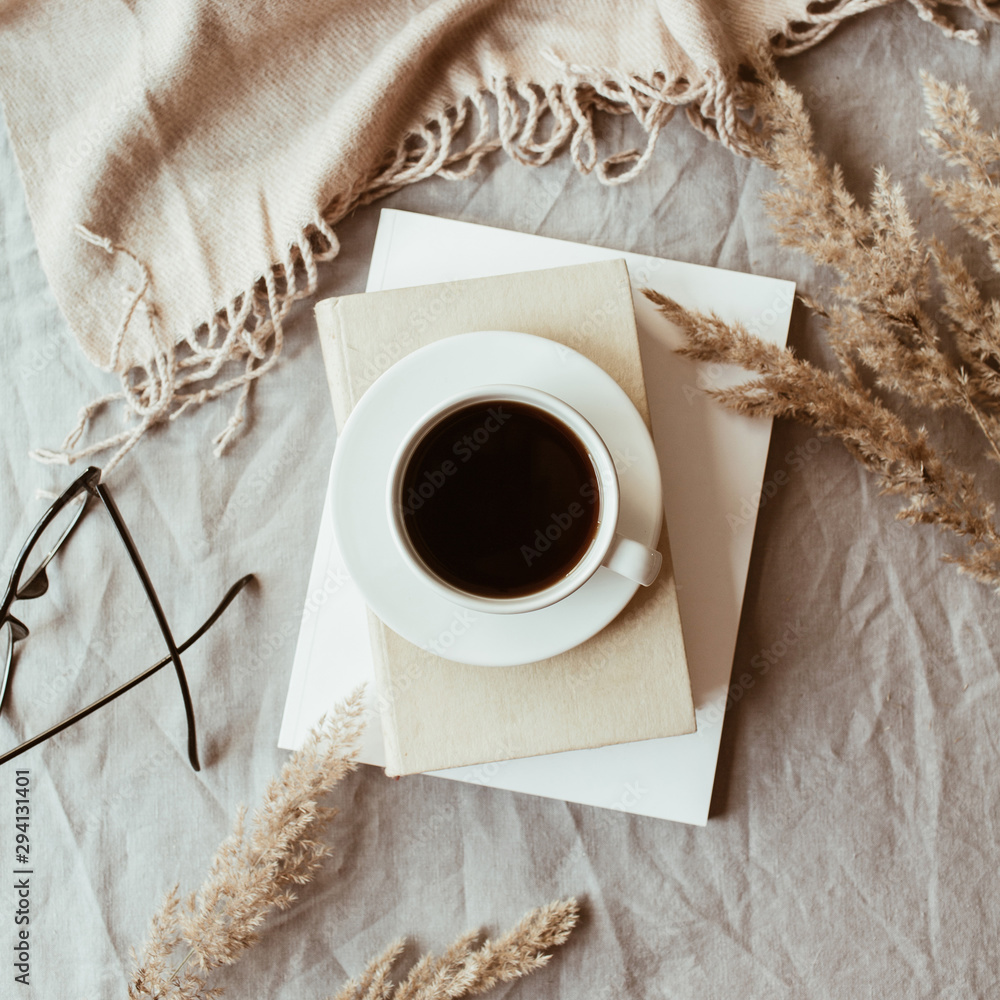 Autumn, fall composition. A cup of coffee lying on the grey linen bed with beige warm blanket, books, glasses and reeds. Lifestyle, hygge concept. Flat lay, top view.