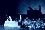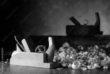 Old wooden jointer and shaving on wooden table.