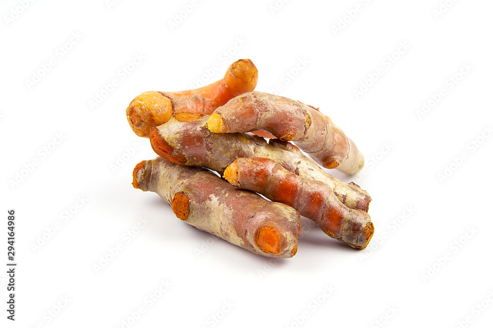 Raw turmeric (Curcuma longa Linn) ingredients for making herbal medicine isolated on white background.