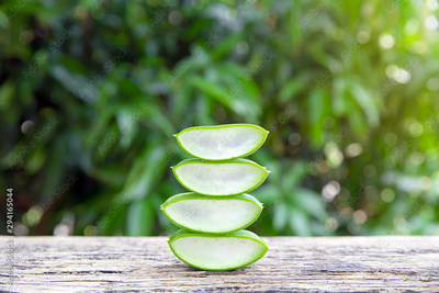 Fresh aloe vera leaves and slices on wooden table for Health products.