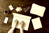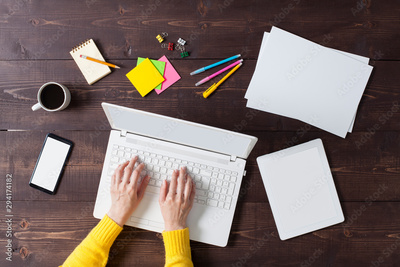 Overhead shot of woman working on laptop.