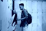 Young attractive casual African American man with backpack leaving things in locker in office cloakroom