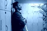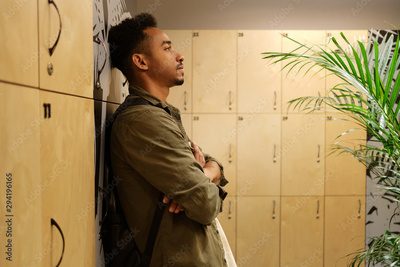 Side view of young handsome casual African American man thoughtfully standing in locker room alone