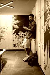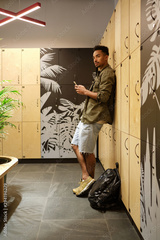 Young serious casual African American man with cellphone thoughtfully looking away in locker room alone