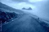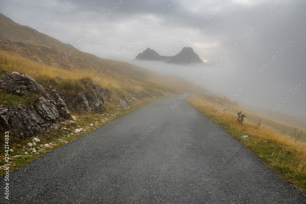 Mountain road in the Durmitor park in Montenegro on a cloudy, foggy morning