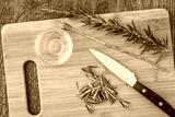Fresh sprigs of rosemary with on a bamboo cutting board, with paring knife and small glass bowl