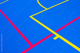 Design of a sports field, with blue background and red and yellow white lines creating strange straight lines and curves, to use with copy space.