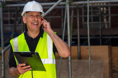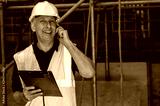 Male Builder Foreman Architect Contractor on Building Site Using Phone and Plans