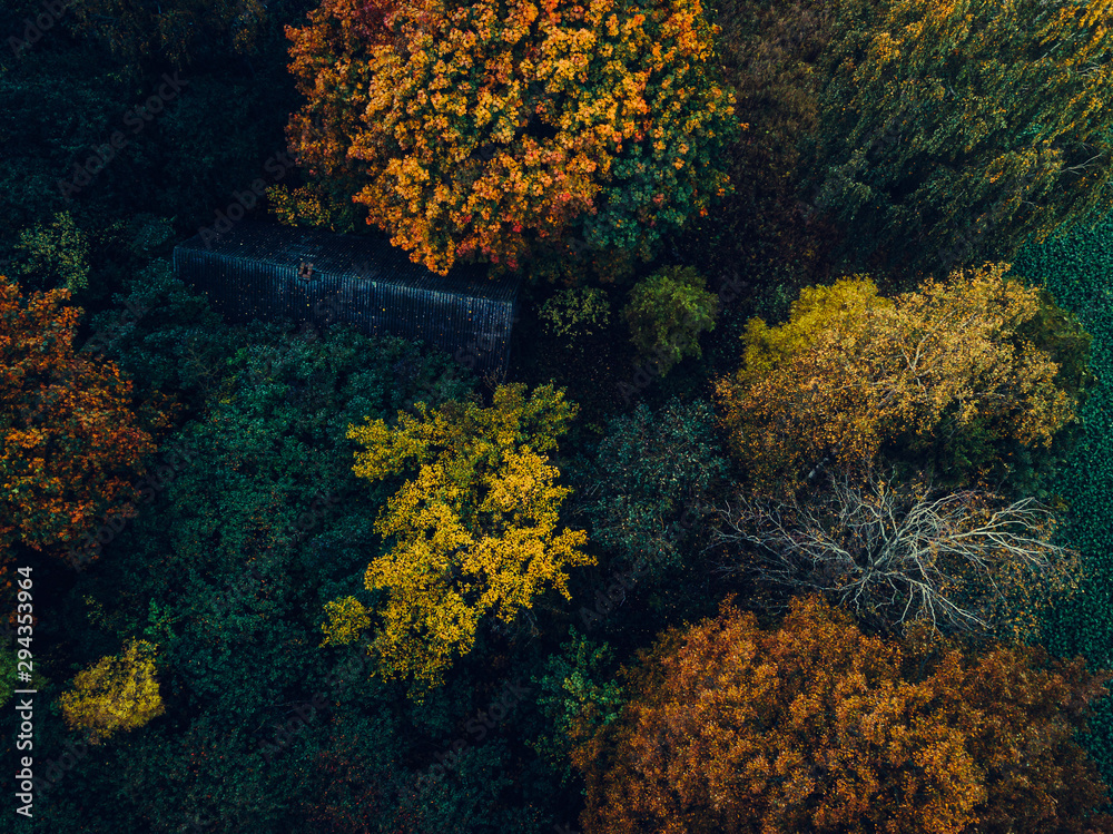 Abstract aerial top down view of autumn colors - abandoned house roof surrounded by trees